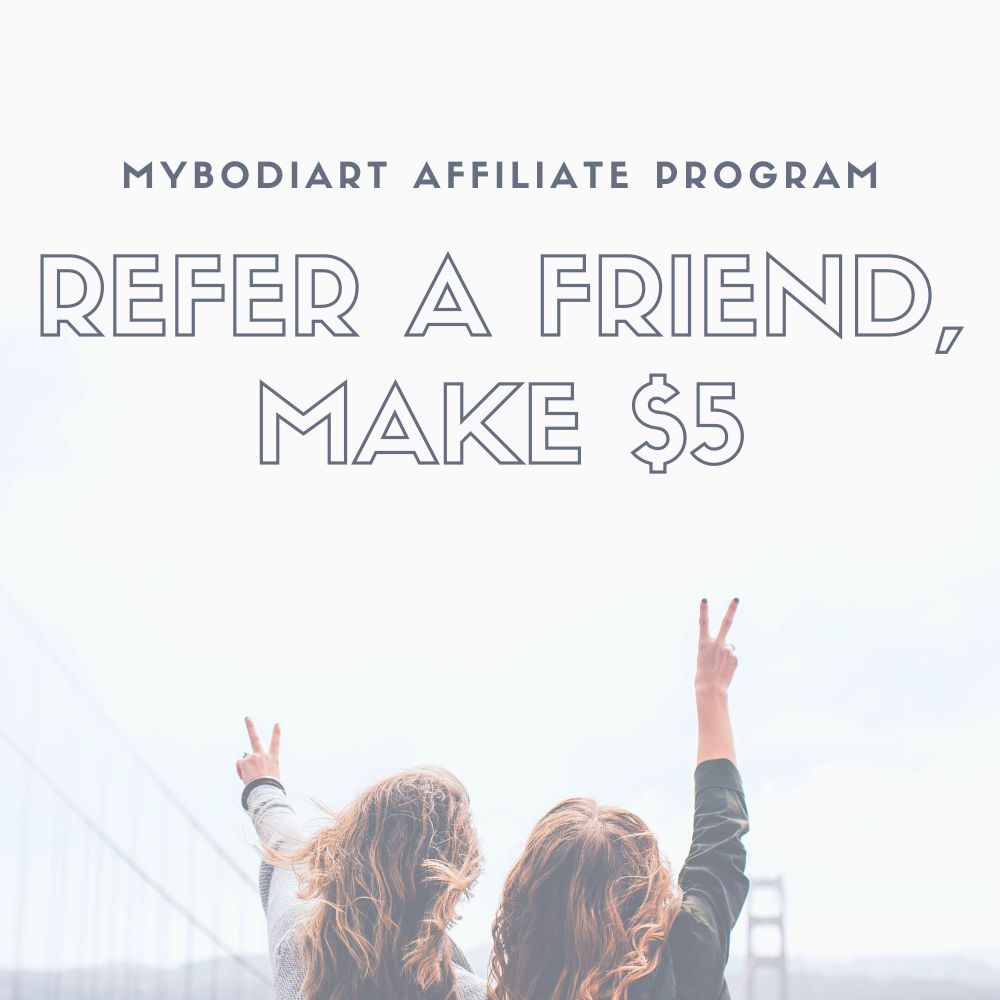 Extra details: Once you apply and you're approved for our referral program you will receive a custom discount code and referral link. Share this with your friends and get paid $5 cash via Paypal within 14 days of conversion. Your discount code will give your friends 10% off their first order. MyBodiArt reserves the right to reject any fraudulent referrals or terminate this offer at any time without notice.